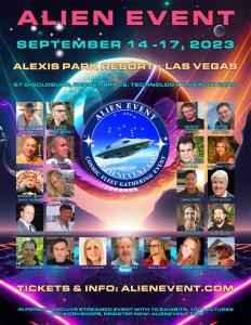 Alien Event, the civilian wing of Cosmic Contact bringing ET Disclosure, Secret Space, UFOLOGY, Alientology & Technology, to Las Vegas on SEPT 14-17, 2023.