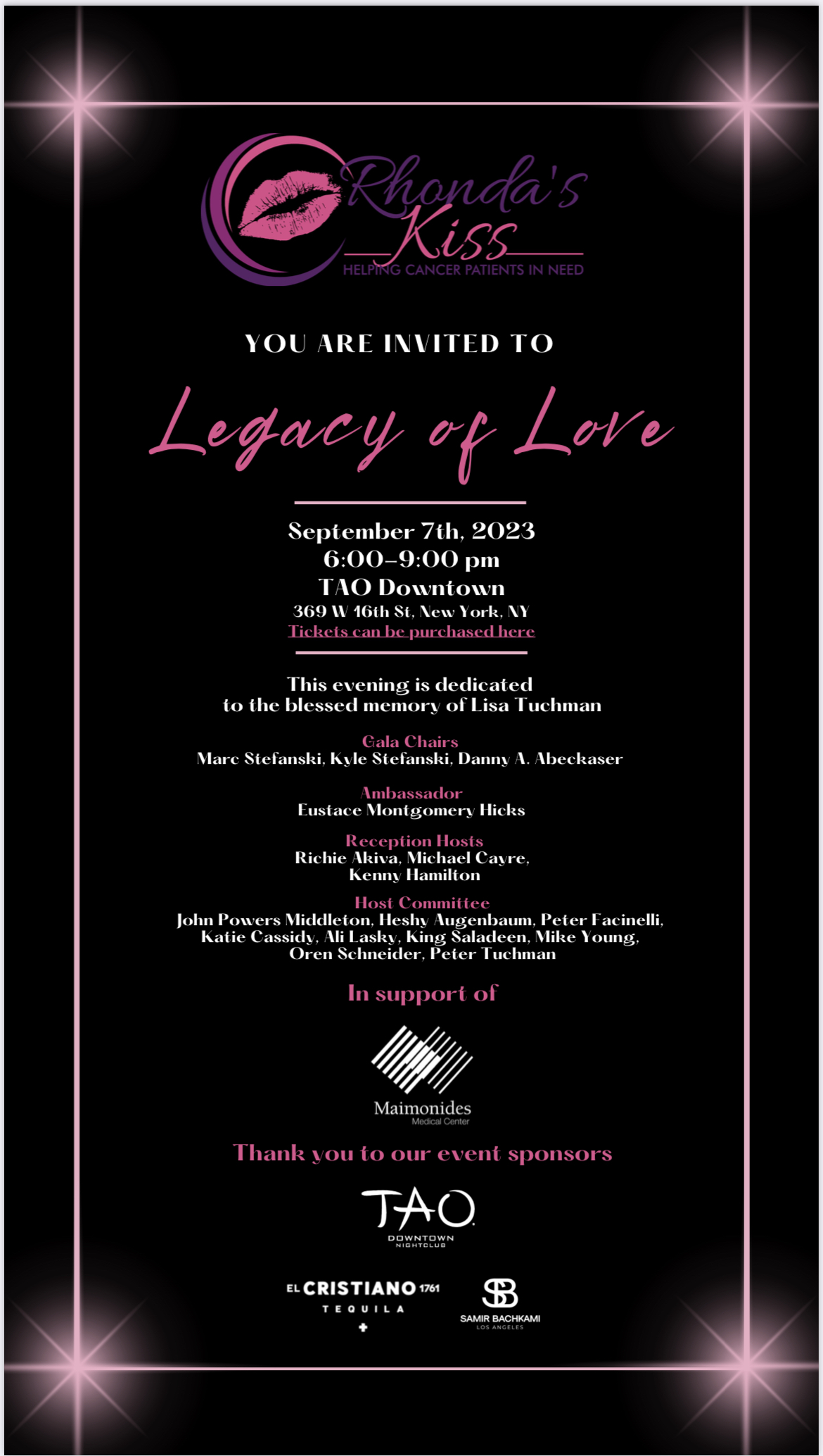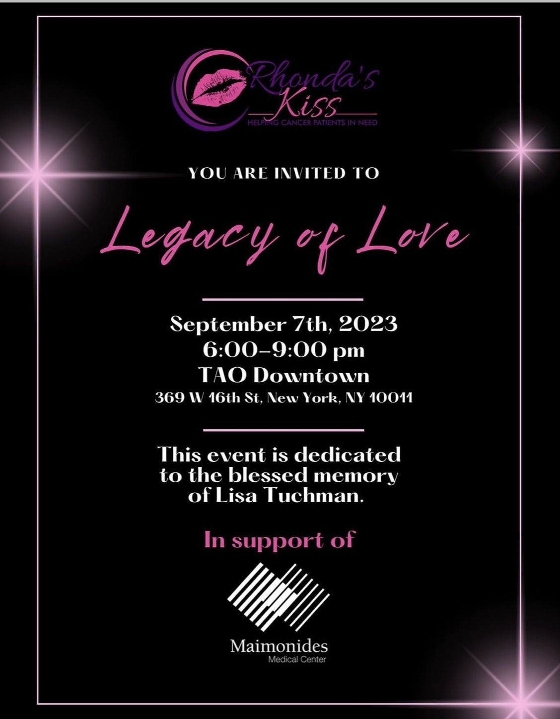The organization and Maimonides are teaming up to host their second annual Legacy of Love Gala in New York, aimed to be an impactful evening of compassion and support to raise awareness for Rhonda's Kiss Cancer Nonprofit. This event held at TAO Downtown this September 7th, 2023, is their annual fashion week fundraising gala with a mission to help cancer patients in need as part of the Cancer Patient Care Program with Maimonides Cancer Center.