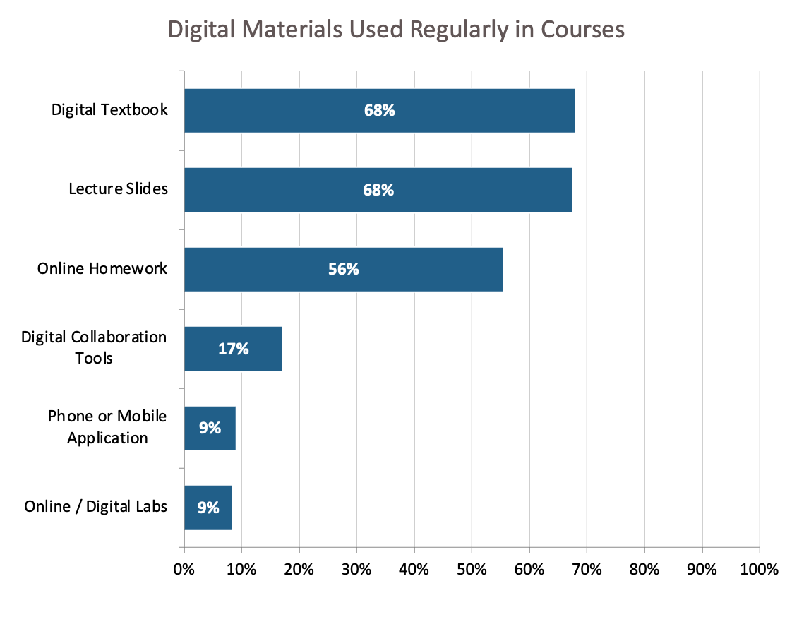 • Faculty are most commonly using digital tools, like digital textbooks and homework software, to replace print tools like physical textbooks and homework handouts. But a small number of faculty are also utilizing new tools that have no physical counterpart, such as digital collaboration tools and student progress monitors.