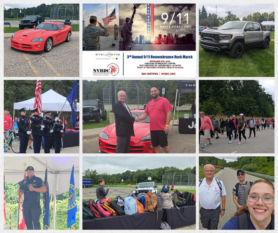 DETROIT, MI, UNITED STATES, September 13, 2023/EINPresswire.com/ -- National Veteran Business Development Council – NVBDC attended the Stellantis’ Veterans Group 9/11 Remembrance Ruck March held at the Chrysler Technology Center on September 8th, 2023. The annual event honors the memory of the September 11, 2001, attacks and pays tribute to the brave men and women who are first responders and who serve or have served in the military.Participants in the ruck march carried weighted backpacks filled with non-perishable items, symbolizing the burdens that military personnel bear in their service to the nation. The backpacks filled with non- perishable items were then donated to 3 non-profit organizations serving Veterans, which included Vets Returning Home, Piquette Square, and Michigan Stand Down.