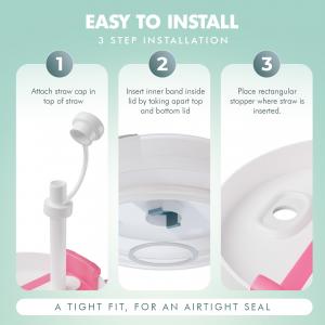 Made in the USA, the silicone spill stopper contains a stopper base, drinking straw topper and slide opening. The two-part straw topper seals the straw hole while allowing continued sipping. The slide opening grants access to contents without fully removing the stopper. These bonus pieces provide versatile drinking while maintaining a spill-proof seal.