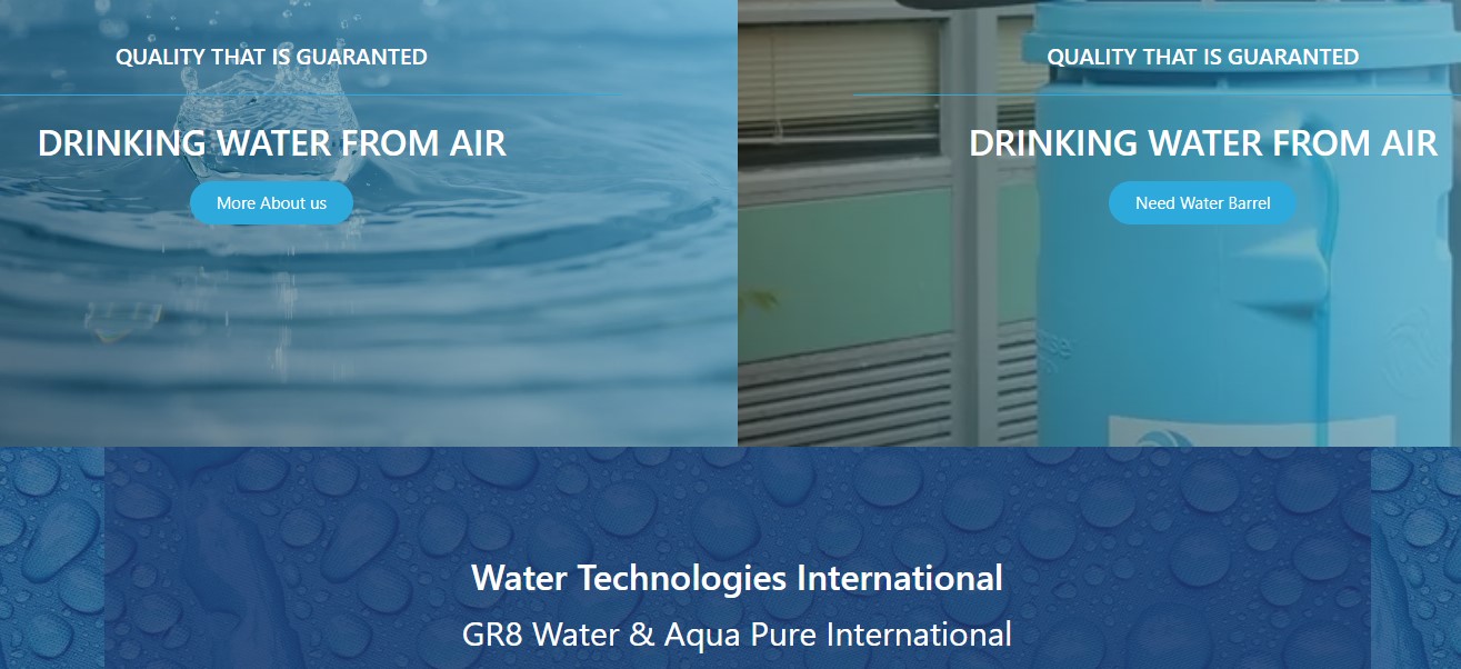 WTII-owned GR8 Water makes freestanding water factory units for the home or office and large, industrial-sized water units using a modular design that can produce up to thousands of gallons of water each day from ambient air. WTII strives to make safe drinking water available to everyone on the planet, making the world a better place in which to live while nurturing the environment.