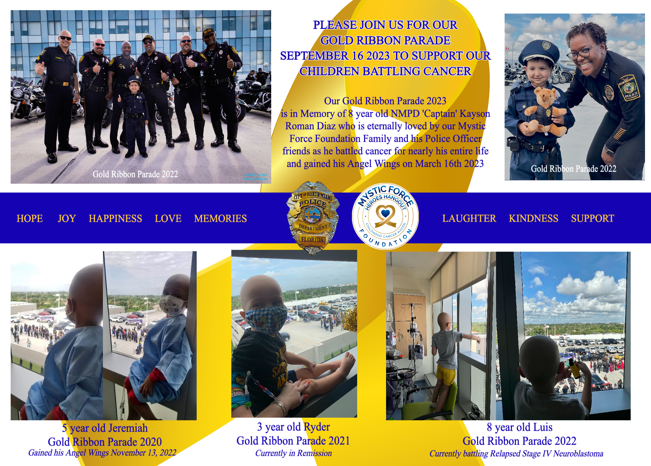 The Gold Ribbon Parade is in support of all children battling cancer. This year the Parade honors the memory of 8 year old ‘Captain’ Kayson Roman Diaz, an honorary North Miami Police Boat Captain who bravely fought cancer nearly his entire life and tragically passed away in March after a 7 year battle with Stage IV Neuroblastoma. Also honoring North Miami Police ‘Jr Officer’ Jeremiah Valera who passed away in December after his own valiant fight, and Gabriela Rivera daughter of Officer Rivera with the Miami-Dade Police Department.