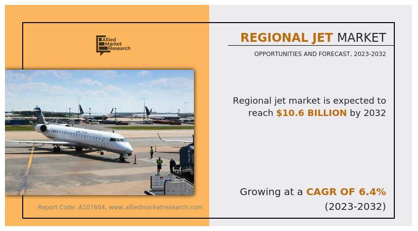 PORTLAND, OREGAON, UNITED STATES, September 14, 2023/EINPresswire.com/ -- Allied Market Research published a report, titled, โRegional Jet Market by Platform (Commercial Aircraft and Military Aircraft), by Seating Capacity (15-80 Seats and 80-125 Seats), and By Maximum Take-off Weight (20,000 lbs. to 80,000 lbs. and 81,000 lbs. to 1,60,000 lbs.): Global Opportunity Analysis and Industry Forecast, 2023-2032โ. According to the report, the global regional jet market generated $5.7 billion in 2022, and is anticipated to generate $10.6 billion by 2032, witnessing a CAGR of 6.4% from 2023 to 2032.