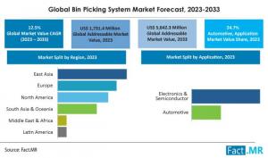 ROCKVILLE, MD, UNITED STATES, September 20, 2023/EINPresswire.com/ -- In 2023, the global bin picking system market size is expected to reach a valuation of US$ 1.7 billion, with a projected compound annual growth rate (CAGR) of 12.5%. By the conclusion of 2033, the market is forecasted to surge to US$ 5.6 billion.The utilization of robotics and computer vision represents the key technologies underpinning bin picking system applications. These advancements enable the precise selection and placement of products, whether they are organized in structured arrays or scattered configurations.