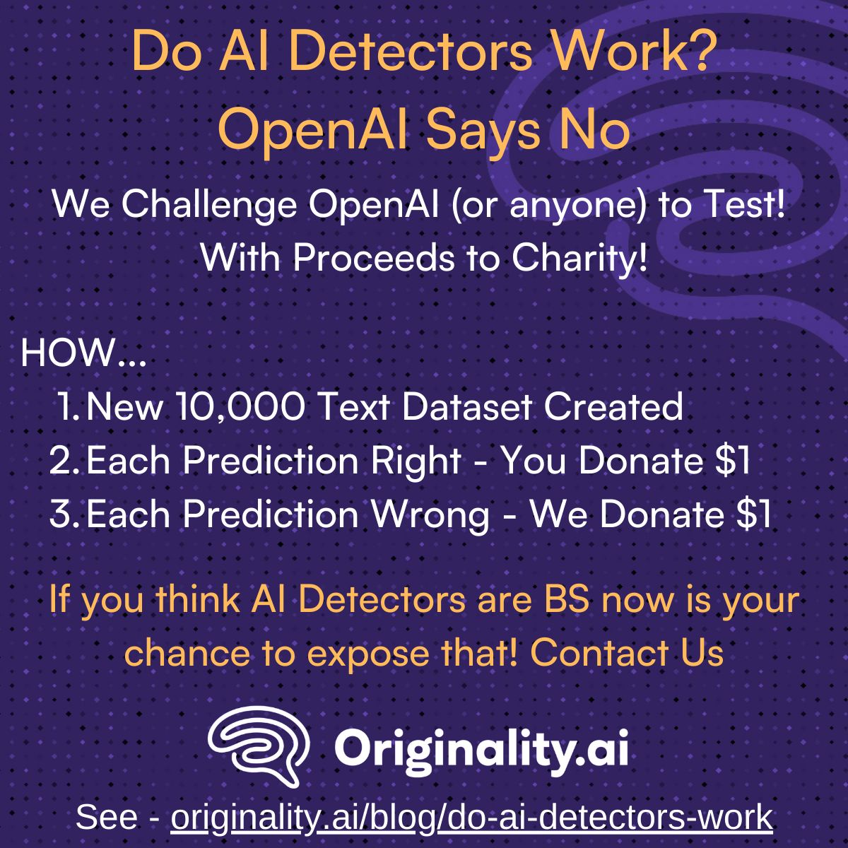 Do AI Detectors work? OpenAI Says No, so, Originality.AI Challenges OpenAI with AI Detection Efficacy Challenge with all proceeds going to Charity.