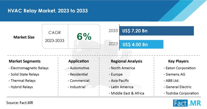 ROCKVILLE, MARYLAND, UNITED STATES, September 21, 2023 /EINPresswire.com/ -- In 2023, the global HVAC relays market size stands at a substantial value of US$ 4 billion, and it is projected to expand significantly, reaching a market size of US$ 7.2 billion by the conclusion of 2033. This growth trajectory is underpinned by an estimated compound annual growth rate (CAGR) of 6% from 2023 to 2033.Within the automotive industry, manufacturers are placing a heightened emphasis on supplying HVAC relays designed for energy-efficient electric vehicles. The burgeoning production and demand for electric vehicles are serving as major drivers propelling the expansion of this market. HVAC, which stands for Heating, Ventilation, and Air Conditioning, encompasses a range of systems aimed at managing air quality and temperature. HVAC relays, acting as either open or closed circuits, play a pivotal role in regulating the power flow to various components within HVAC systems.