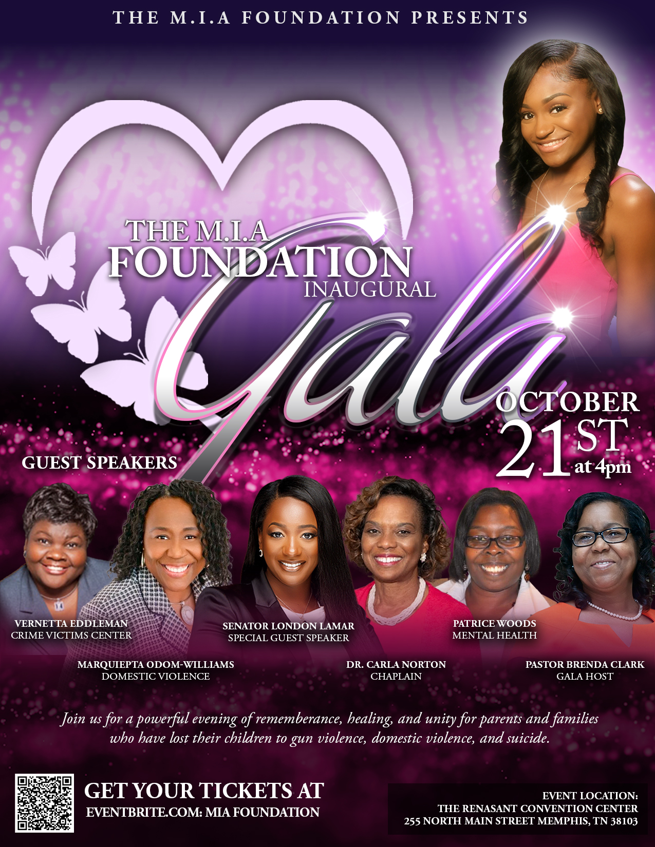 MEMPHIS, TN, UNITED STATES, September 25, 2023 /EINPresswire.com/ -- The inaugural M.I.A. Foundation Wind Beneath My Wings Gala is Saturday, October 21st at 4 p.m. This powerful evening of remembrance, healing, and unity is for parents and families who have lost children to gun violence, domestic violence, or suicide. Tennessee Senator London Lamar is the special guest speaker. R&B Singer Devin Crutcher will provide the entertainment. The Wind Beneath My Wings Gala will be held in the Renasant Convention Center at 225 North Main St. in downtown Memphis, TN.