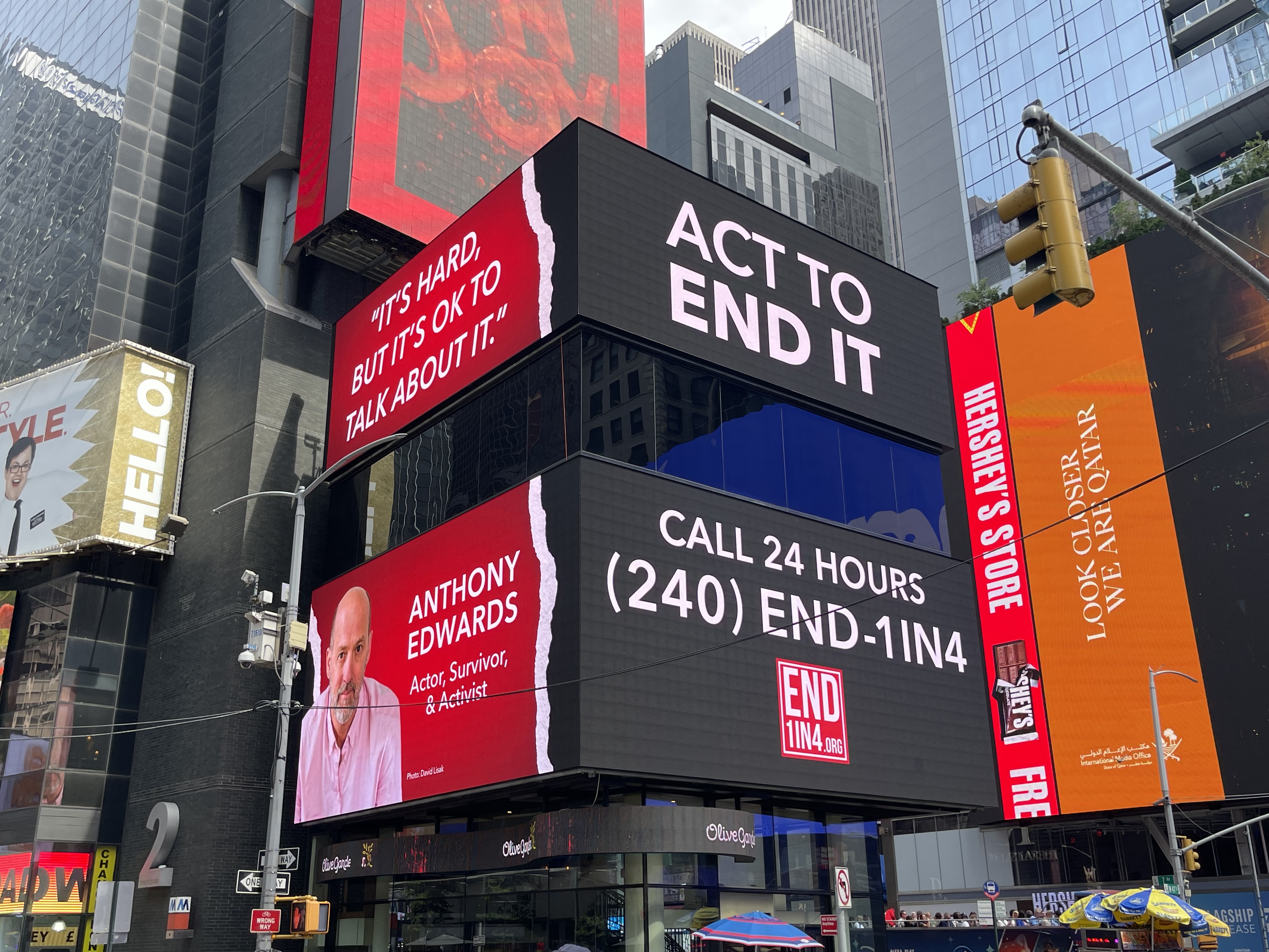 Ashley Judd & Anthony Edwards Launch END1IN4 Child Sex Abuse Campaign, Lighting Up Times Square; Across Miami; & in L.A.