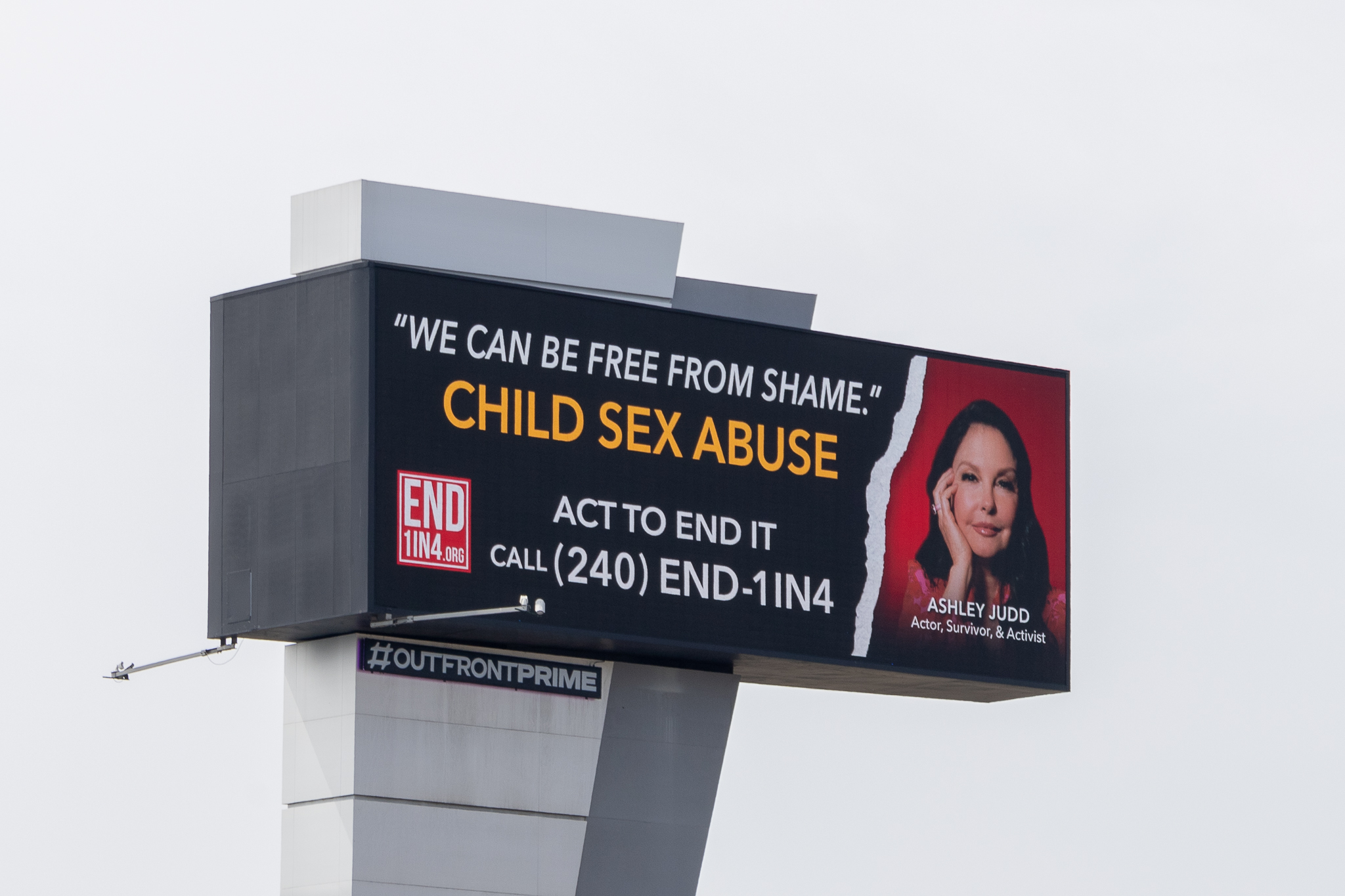 Ashley Judd Lights Up Times Square NYC on one of the END1IN4 Child Sex Abuse Campaign billboards. Photo: END1IN4