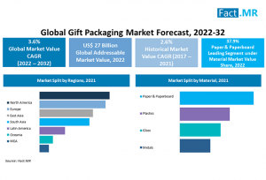 ROCKVILLE, MD, UNITED STATES, September 26, 2023 /EINPresswire.com/ -- In 2022, the worldwide gift packaging market size was valued at approximately USD 27 billion, with projections indicating it will exceed USD 38 billion by 2032. This growth is expected to occur at a steady compound annual growth rate (CAGR) of 3.6% from 2022 to 2032.In 2022, the worldwide gift packaging market represented approximately 3% of the total global packaging market. During the evaluation period from 2022 to 2032, the global gift packaging market is projected to offer a substantial economic opportunity of USD 11 billion.