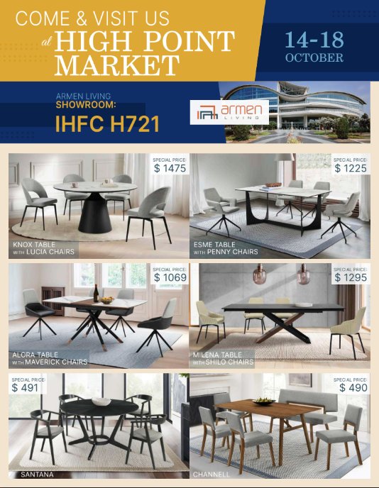 To welcome market buyers Armen Living is hosting a “This is Living - Fall Fiesta” on Sunday, October 15 from 11 a.m. to 1 p.m. in IHFC Building, 7th floor, Hamilton Wing, Space H-721 (201 E Commerce Ave, High Point, NC). This event’s hospitality will feature a fun Fiesta theme with catered delights, a dessert bar, and mimosas. RSVP to attend on Eventbrite.