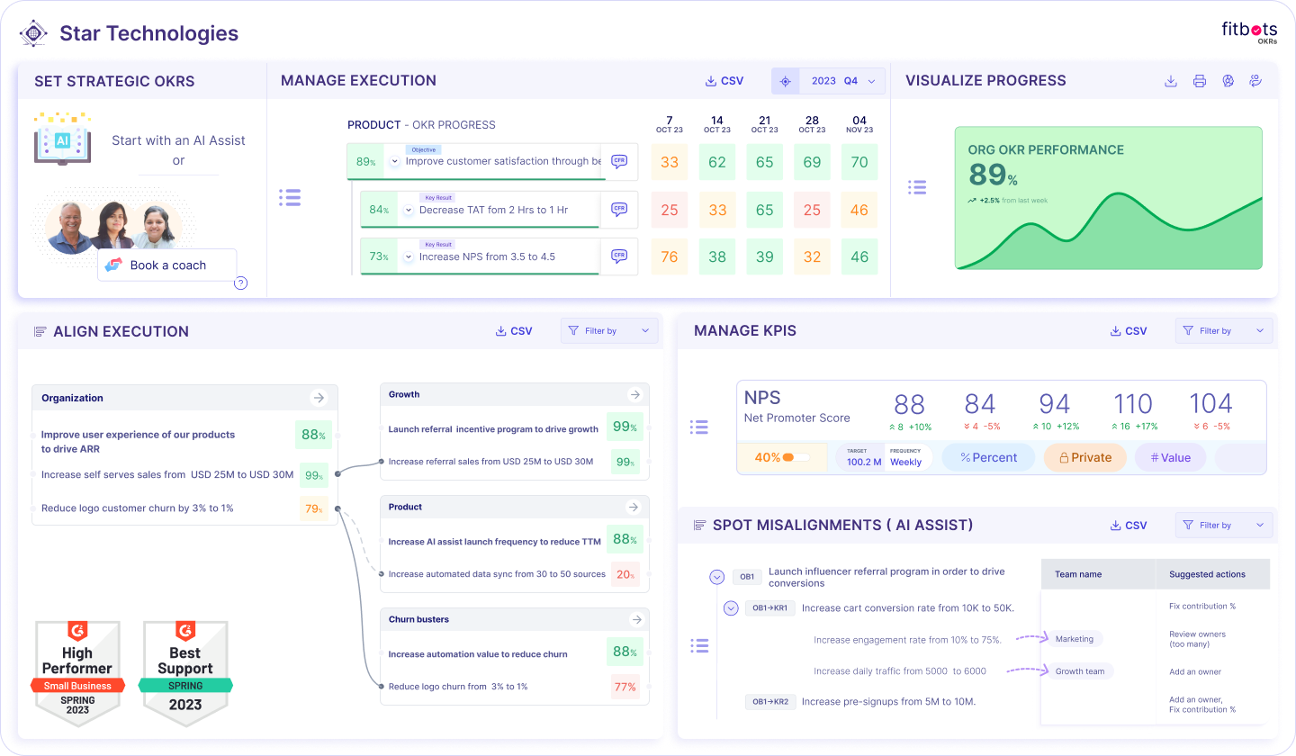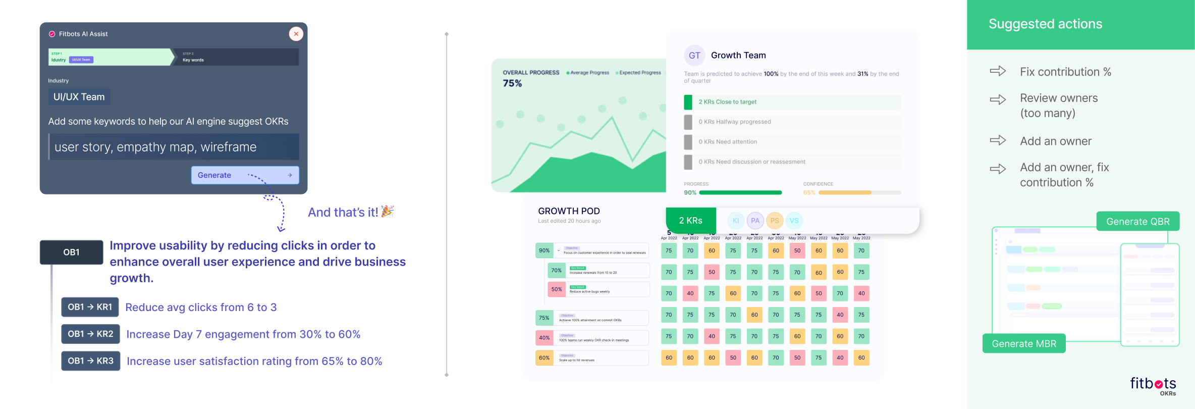 1. AI-Assist for OKR: Fitbots introduces a co-author for OKRs, a cutting-edge tool that empowers organizations and teams to transform their strategic objectives into impactful key results. This AI-powered capability not only helps in the creation of OKRs but also enhances them with the addition of 'Inspire' and 'Strategy Assist' functionalities in the near future, making the alignment of strategy and execution seamless. The initial versions of this capability have been operational since Feb 2023 and are now being further refined with market intelligence to be the “best-in-class” Co-Author capability in the strategy execution world.