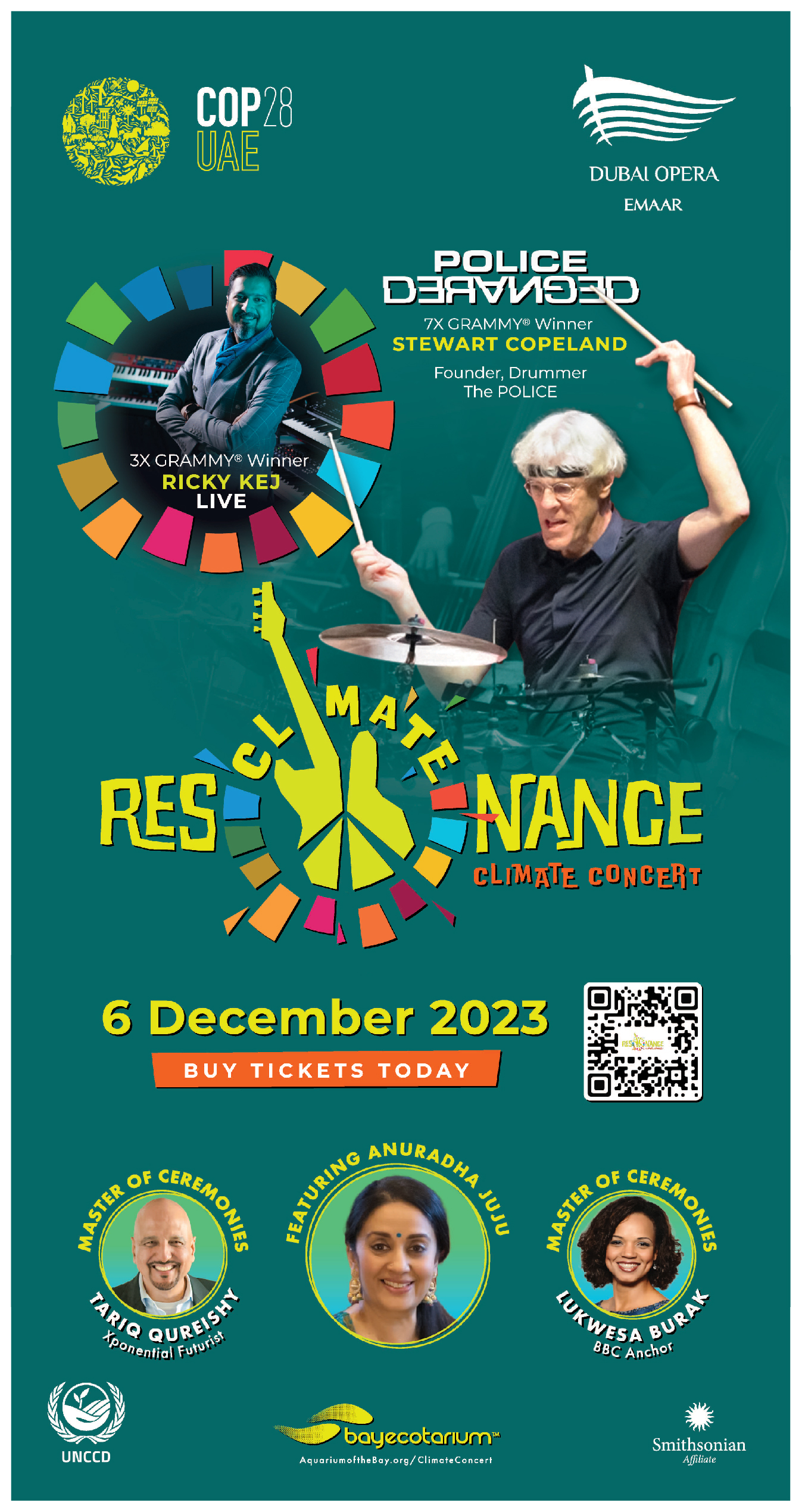 SAN FRANCISCO, CA, UNITED STATES, September 27, 2023 /EINPresswire.com/ -- Legendary co-founder of the Police, 7X Grammy Winner Stewart Copeland and 3X multi-Grammy winner Ricky Kej will join the Smithsonian Affiliated Bay Ecotarium in San Francisco, for a Climate Concert titled Resonance being held in conjunction with the UN COP28 at Dubai Opera on December 6, 2023. “I grew up in Berkeley- the BayEcotarium is in my backyard. Let’s save the Bay… and the rest of the world while we are at it!”, says Stewart. The Police De-Ranged musical tribute to climate resilience will be performed with the trailblazing, all-women Firdaus (paradise in Arabic) orchestra ensemble based at the Dubai World Expo City. In a candid conversation with the visionary Smithsonian affiliated Aquarium of the Bay and Bay Ecotarium President & CEO Dr. George Jacob, Ricky lauded the transformative initiative for creating an interconnected web of Oceanariums and Climate Literacy centers around the world, and remarked, “ All of us are transient guardians of this Blue Marble we call home- join us in chorus in resonance to restore our beautiful planet.”