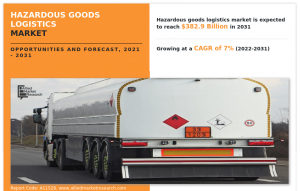 OREGAON, PORTLAND, UNITED STATES , September 27, 2023 /EINPresswire.com/ -- According to the report published by Allied Market Research, the global hazardous goods logistics market generated $200 billion in 2021, and is projected to reach $382.9 billion by 2031, growing at a CAGR of 7% from 2022 to 2031. The report offers a detailed analysis of the top winning strategies, evolving market trends, market size and estimations, value chain, key investment pockets, drivers & opportunities, competitive landscape and regional landscape. The report is a useful source of information for new entrants, shareholders, frontrunners and shareholders in introducing necessary strategies for the future and taking essential steps to significantly strengthen and heighten their position in the market.