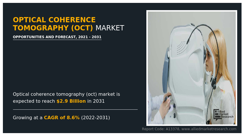 PORTLAND, OREGON, UNITED STATES, September 28, 2023 /EINPresswire.com/ -- The Optical Coherence Tomography (OCT) Market has seen impressive growth due to its critical role in non-invasive medical imaging and diagnostics. OCT technology employs light waves to create high-resolution cross-sectional images of tissues, making it invaluable in various medical fields, including ophthalmology and cardiology. During the COVID-19 pandemic, OCT's adaptability and precision have allowed healthcare providers to continue offering essential diagnostic services remotely, driving further demand. Advances in OCT technology have led to more accurate diagnoses and improved patient care. The global optical coherence tomography (oct) market was valued at $1.2 billion in 2021 and is projected to reach $2.9 billion by 2031, growing at a CAGR of 8.6% from 2022 to 2031.