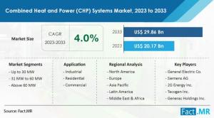 ROCKVILLE, MD, UNITED STATES, September 28, 2023 /EINPresswire.com/ -- According to a report from Fact.MR, the global sales of combined heat and power (CHP) systems reached a total of US$ 20.17 billion in 2023 and are projected to increase to US$ 29.86 billion by the close of 2033. The CHP systems market is anticipated to grow at a compound annual growth rate (CAGR) of 4% over the next decade, presenting an absolute dollar opportunity of US$ 9.68 billion.Cogeneration, also known as combined heat and power systems, encompasses a suite of technologies primarily aimed at simultaneously generating both usable heat and electricity. Thanks to the heightened energy efficiency, reduced operational expenses, minimal CO2 emissions, and other advantages inherent to combined heat and power systems, this concurrent production of usable heat and electricity is significantly more efficient than separate generation processes for each.