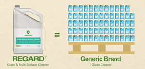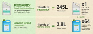 The concentrated formulas in the new REGARD line also help reduce environmental impact by providing more end-use cleaning solution delivered in fewer shipments. A single 3.78L bottle of highly concentrated REGARD™ Eco-Friendlier Glass and Multi-Surface Cleaner can produce more than 245 litres of diluted solution, equivalent to 64 containers of 3.8 litre pre-mixed glass cleaner—a significant environmental and cost savings.