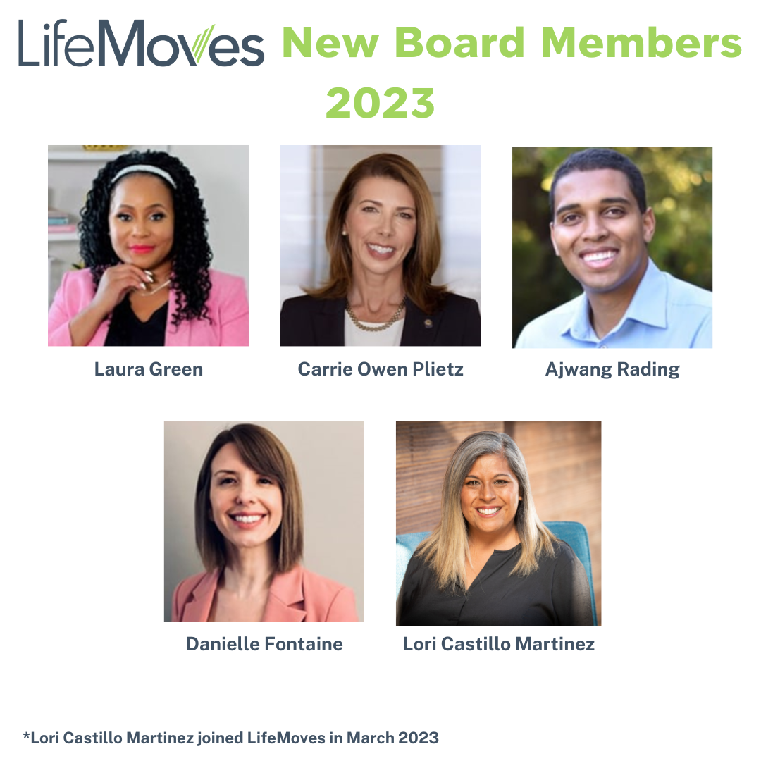“I’m honored to welcome these remarkable individuals to our Board of Directors,” said Aubrey Merriman, Chief Executive Officer of LifeMoves. “Strengthening our Board of Directors and staff in service to our communities is foundational. As we continue strengthening our core, we are poised to amplify our impactful initiatives and create sustainable solutions for our unhoused neighbors. It is especially important that our Board membership reflects the communities and individuals that we serve. Our Board of Directors is comprised of dedicated and diverse leaders committed to achieving our vision of thriving communities where every neighbor has a home. We are excited to leverage the talents of Ajwang Radding, Carrie Owen Plietz, Danielle Fontaine, and Laura Green, and their extraordinary leadership, unique perspectives, and lived experiences, along with Lori Castillo Martinez, whom we added earlier in the year, to fortify our determination to do our part to end homelessness.”