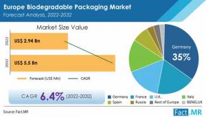 ROCKVILLE, MD, UNITED STATES, September 29, 2023 /EINPresswire.com/ -- The Europe biodegradable packaging materials market size reached an approximate value of USD 2.94 Billion in 2022, with projections indicating it is poised to exceed USD 5.5 Billion by 2032. This growth is expected to occur at a steady Compound Annual Growth Rate (CAGR) of 6.4% from 2022 to 2032.The expansion of the European biodegradable packaging market can be attributed to the increasing adoption of biodegradable packaging across various end-use sectors, including food and packaging, consumer goods, and pharmaceuticals. Additionally, the growing trend of using biodegradable packaging in the form of bags and boxes is driving market growth during the evaluation period.