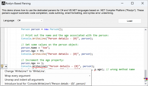 Code Fix/Code Refactoring is now supported for Roslyn C# and Visual Basic parsers.