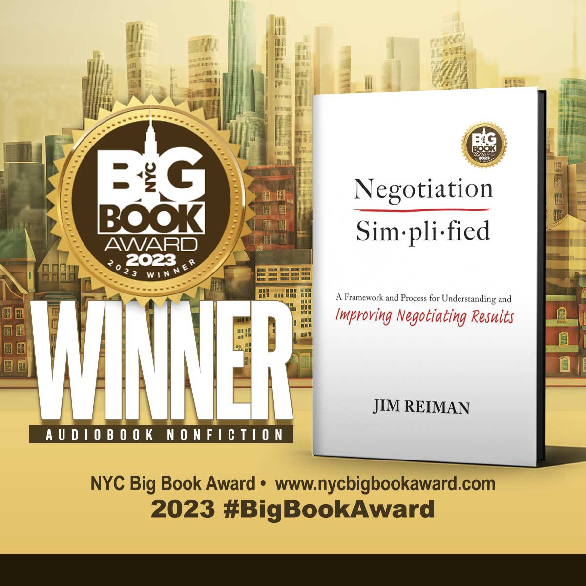 BROOKLYN, NY, UNITED STATES, October 4, 2023 /EINPresswire.com/ -- In competition with large houses and independent publishers, Reiman's book: Negotiation Simplified stood out. The committees that judge the annual NYC Big Book Award competition are experts from different aspects of the book industry, including publishers, writers, editors, book cover designers and professional copywriters. Selected award winners are based on overall excellence.The NYC Big Book Award recognized Negotiation Simplified: A Framework and Process for Understanding and Improving Negotiating Results as the Winner in the Audiobook: Nonfiction category. This is the book’s second award. In August, 2022, the book received the Nonfiction Authors Association’s highest award – Gold. The book and author Jim Reiman were also featured on two highly acclaimed podcasts, Mark Gandy’s CFO Bookshelf (CFO Bookshelf – Growing the Minds of Financial Leaders) and Jason Wick’s Leadership Voyage (Leadership Voyage (buzzsprout.com).