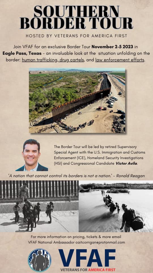 The national Veterans organization will be hosting a trip to the Southern Border at Eagle Pass Texas bringing with them a film production crew. The event is scheduled for November 1st through the 4th 2023. The border tour will highlight VFAF endorsed candidates Sandy Smith (NC1) and Victor Avila (TX23). For inquiries about attending email caitcorrigan@protonmail.com