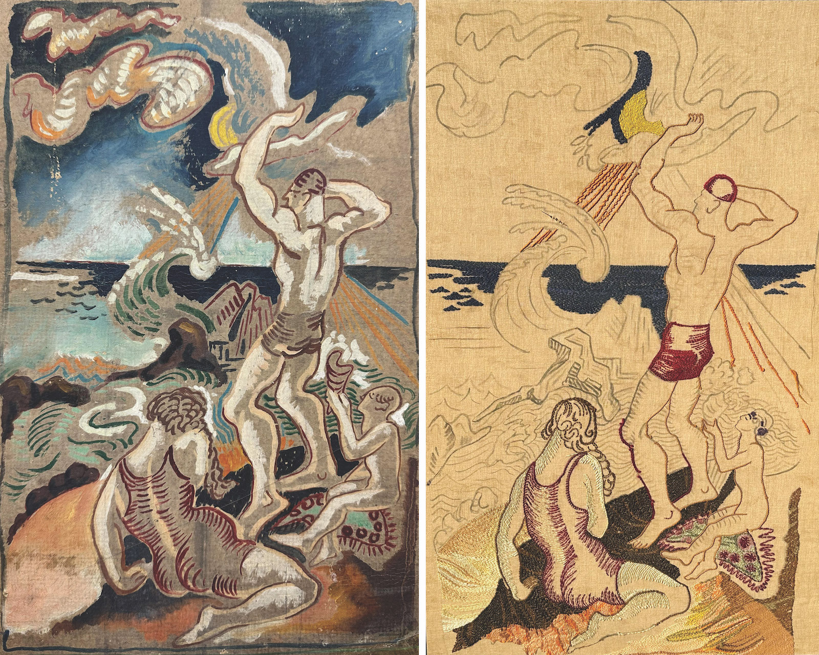 Benton was a champion of Realism whose initial opposition to the Modernist movement seemed untenable, but in the early 1920s, Benton reconsidered and opted to explore the new style. That sea change in Benton’s career is embodied in an associated pair of artworks to be auctioned on October 14th as one lot. His mixed-media painting on board, executed circa 1922, is titled Benton Family on South Beach. The 13.75-inch by 9.5-inch work served as the study for a much larger (53-inch by 33-inch) textile which he envisioned his wife, Rita, embellishing with needlework. The linen panel was never fully stitched, thus leaving much of Benton’s original composition visible.