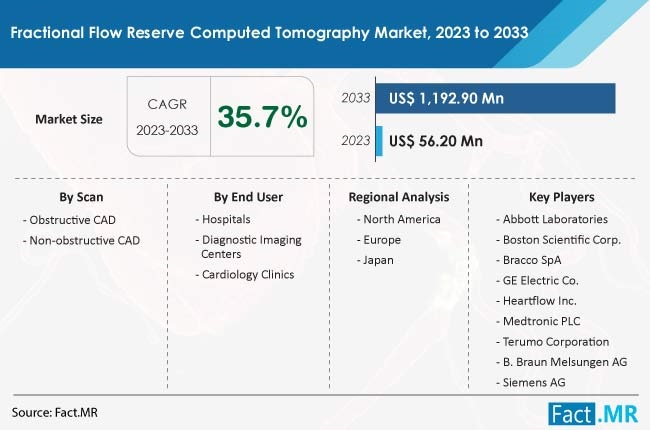 ROCKVILLE, MARYLAND, UNITED STATES, October 3, 2023 /EINPresswire.com/ -- According to an industry analysis conducted by Fact.MR, the global fractional flow reserve computed tomography market size is poised for remarkable growth. It is anticipated to transition from a valuation of US$ 43.5 million in 2023 to an impressive US$ 1.2 billion by the year 2033, marking an exceptional compound annual growth rate (CAGR) of 35.7% over the course of the decade.FFRCT represents a relatively new and innovative technique, with only one approved product currently available in the market. Despite its nascent stage, this technology has the potential to make a significant impact. In 2022, the FFRCT market held a modest share of 0.2% in terms of value within the broader global diagnostic imaging devices market, which was valued at US$ 23.7 billion. Coronary artery disease (CAD) stands as a prevalent health concern characterized by the accumulation of blockages within the arteries responsible for supplying blood to the heart. CAD arises from the development of atherosclerosis, a condition that leads to the narrowing and obstruction of these vital arteries.