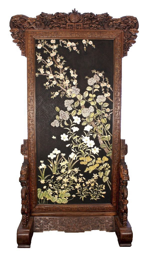 Leading the Asian selection, an elaborate Chinese Qing Dynasty inlaid hardwood palace screen stands 82 inches tall and is elaborately decorated with flowering branches and intricate patterns. Estimate: $30,000-$50,000