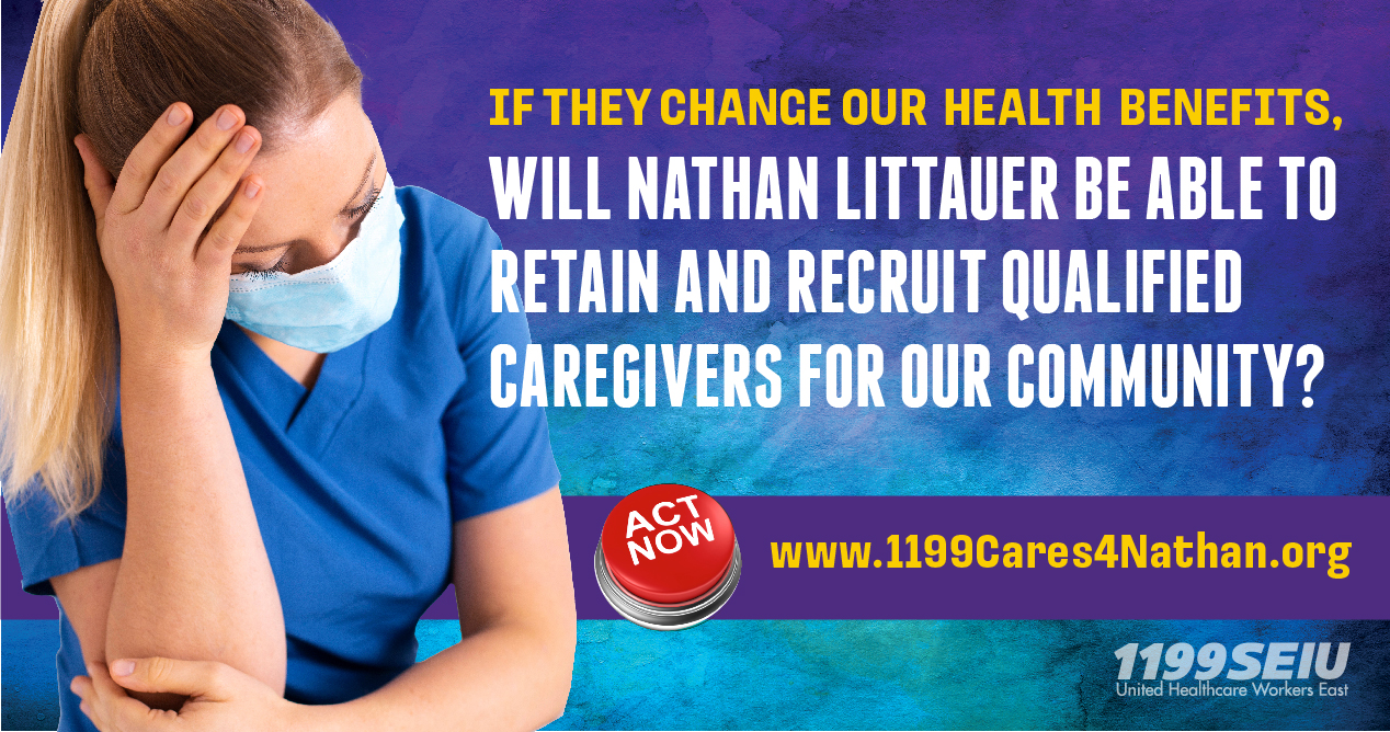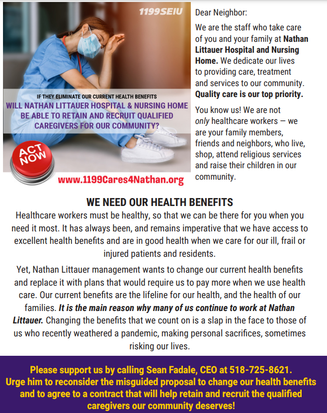 "We don’t only work here — we're also part of the community - we count on Nathan Littauer, our families have counted on the hospital for generations, As healthcare workers, we must to healthy to do our jobs. For that, we need affordable health benefits. Management says it's not a financial issue for them, then what is the hold up?"