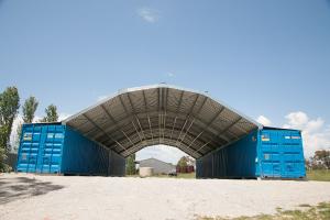 Made in the USA of American steel, Podroof kits from Shield Roof Solutions are custom-designed for attachment to shipping containers for use as permanent or temporary shelters. They arrive as ready-to-assemble kits for easy assembly.