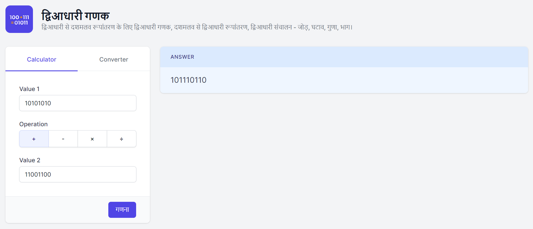 द्विआधारी संख्याओं की गणना: इस गणक की मदद से उपयोगकर्ता द्विआधारी संख्याओं का जोड़, घटाव, गुणा और विभाजन कर सकते हैं।