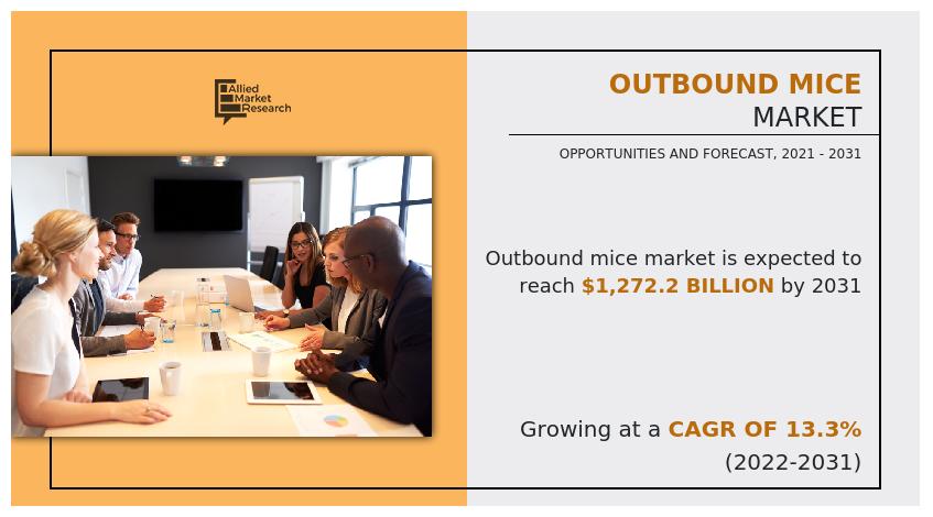 PORTLAND, 5933 NE WIN SIVERS DRIVE, UNITED STATES, October 8, 2023 /EINPresswire.com/ -- According to a new report published by Allied Market Research, titled, “Outbound MICE Market," The outbound mice market was valued at $225.90 billion in 2021, and is estimated to reach $1272.2 billion by 2031, growing at a CAGR of 13.3% from 2022 to 2031.