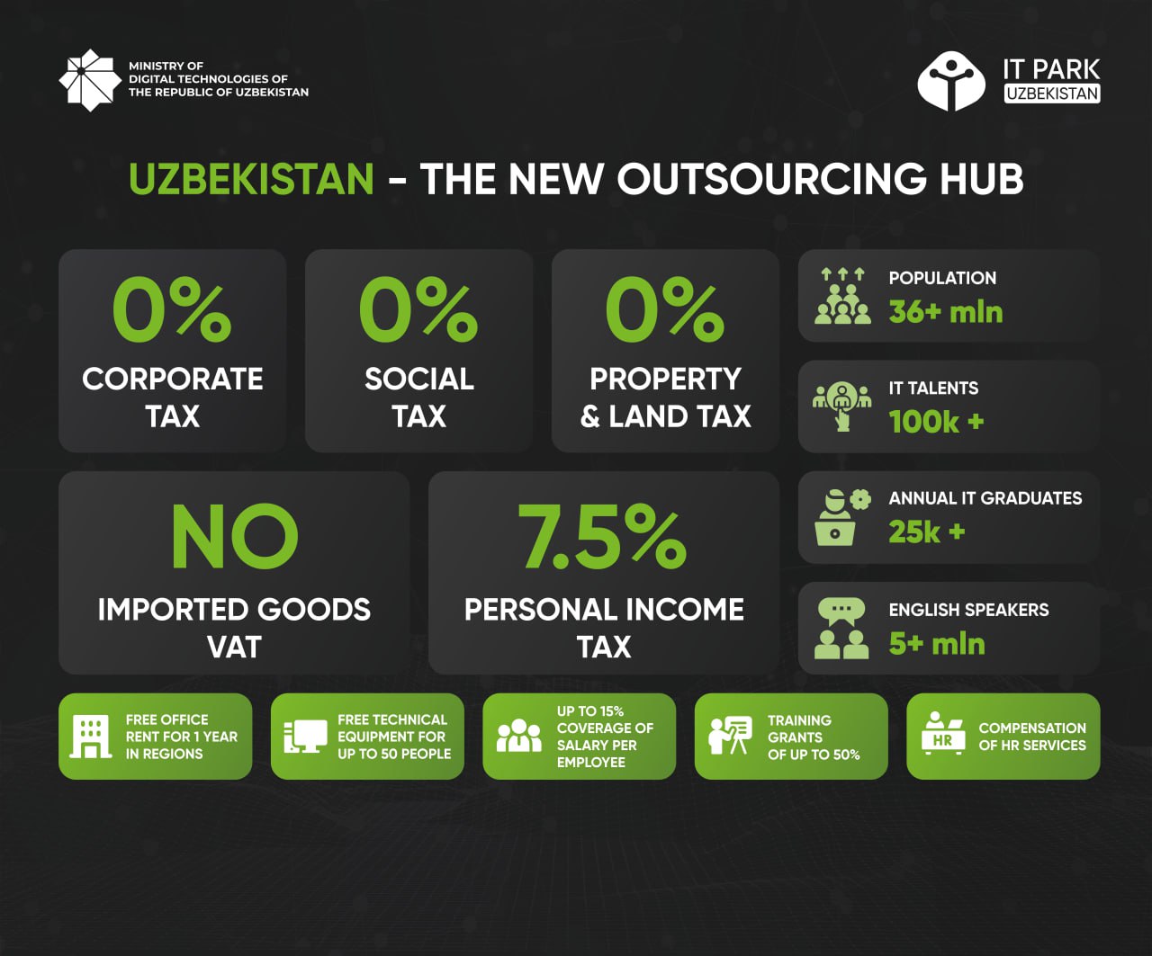 ● Reimbursement of up to 15% of payroll expenses for Uzbekistan citizen employees, and of up to 50% of costs incurred in attracting international mentors to the country.