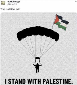 An outlandish social media post from BLM Chicago shows a parachutist with a Palestinian flag and the words "I stand with Palestine" on it. At the time of this release, it is the group's Facebook Banner. Earlier this week, Hamas sparked war in the Middle East and sent parachutists into the site of a large party in Israel, opening fire on and kidnapping unarmed civilians in the crowd. They have since fired thousands of rockets into Israel, killing hundreds. Iran, the largest state sponsor of terror is a major source of funding for Hamas and recently received billions in freed up funds from the Biden Administration.