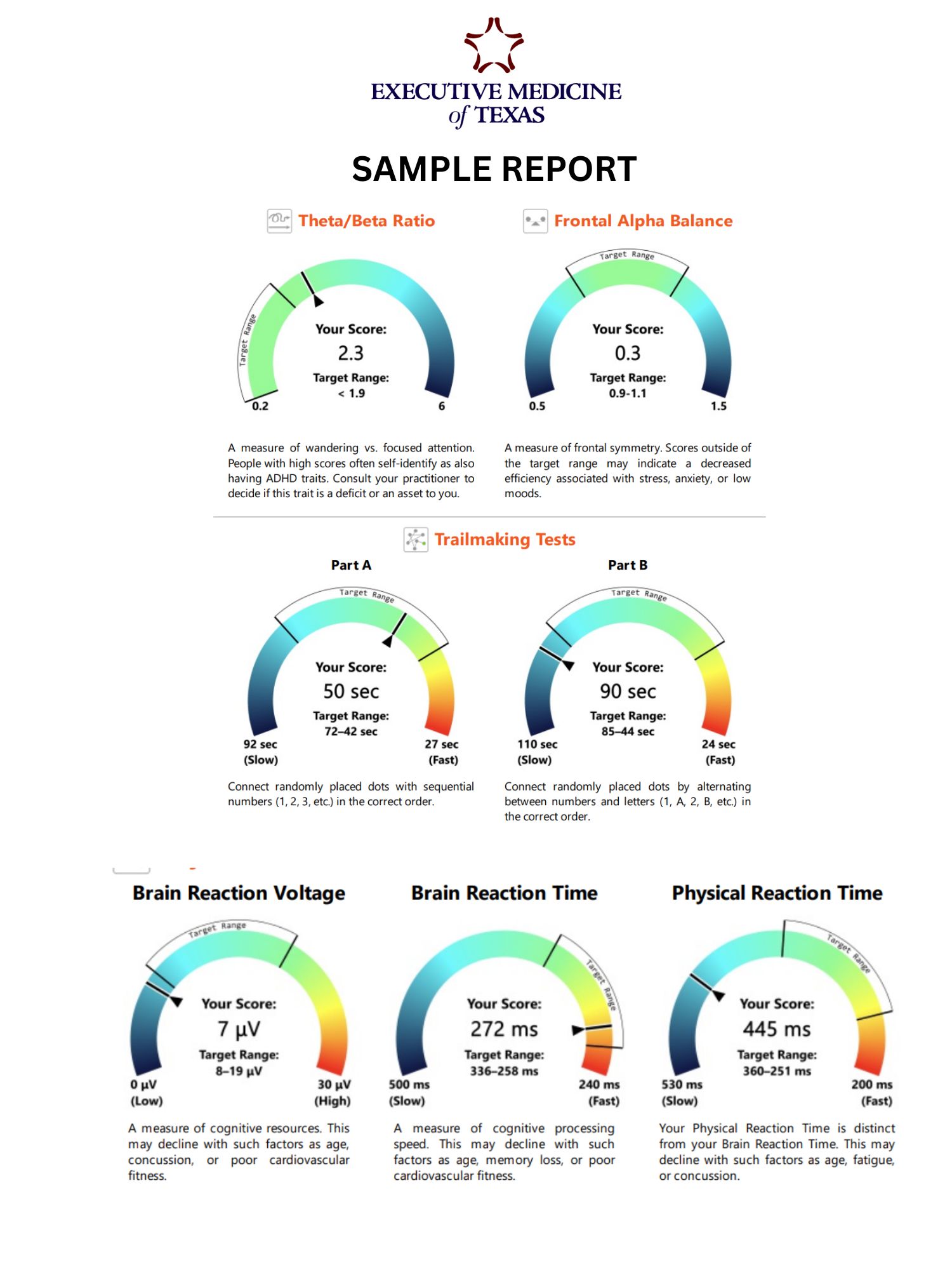 “Our goal is to help all of our patients stay on top of their game, whether they’re CEOs, professional athletes, or other busy individuals just looking to stay sharp,” says J. Mark Anderson, MD, MPH, Founding Partner of Executive Medicine of Texas and co-author of the book Age to Perfection: How to Thrive to 100, Happy, Healthy and Wise. “Brain mapping also gives us objective data when monitoring progress during our patient’s optimization program.”