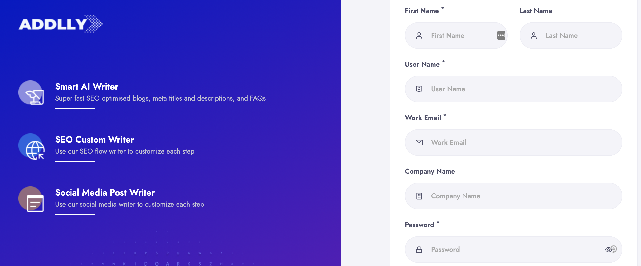 • No Prompt Required: Other writers require complex prompts and specific keywords to generate the results users are looking for. With Addlly, users can create articles, blogs and social media posts in just one sentence, or by providing a link!