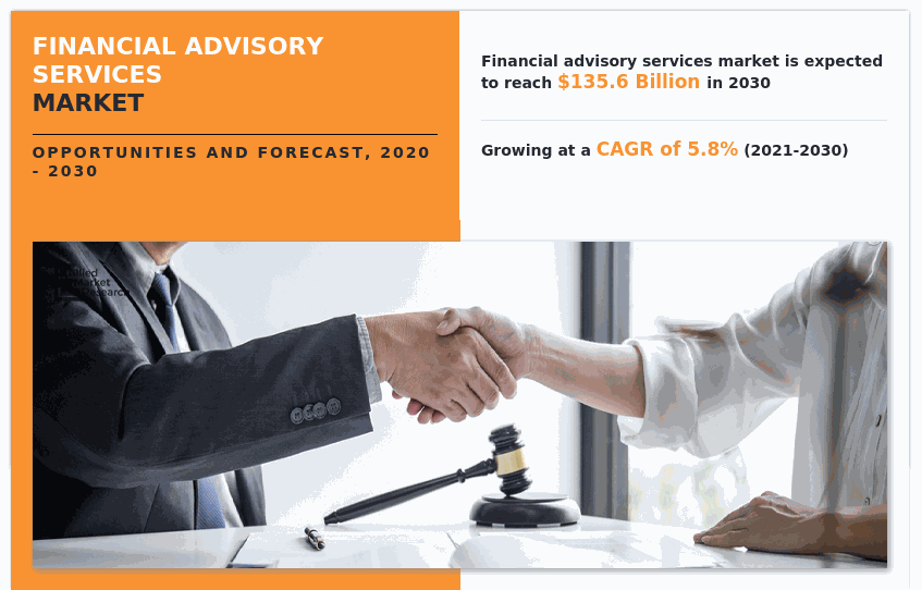 Allied Market Research recently published a report, titled, "Financial Advisory Services Market by Type (Corporate Finance, Accounting Advisory, Tax Advisory, Transaction Services, Risk Management, and Others), by Organization Size (Large Enterprises, and Small & Medium-Sized Enterprises), by Industry Vertical (BFSI, IT and Telecom, Manufacturing, Retail and E-Commerce, Public Sector, Healthcare, and Others): Global Opportunity Analysis and Industry Forecast, 2020-2030." According to the report, the global financial advisory services industry was pegged at $79.4 billion in 2020, and is expected to reach $135.6 billion by 2030, growing at a CAGR of 5.8% from 2021 to 2030.