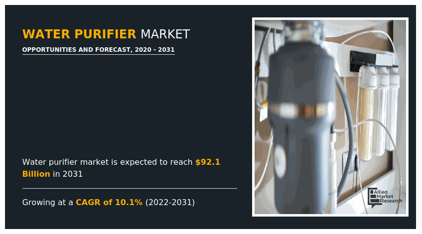 PORTLAND, 5933 NE WIN SIVERS DRIVE, UNITED STATES, October 18, 2023 /EINPresswire.com/ -- According to a new report published by Allied Market Research, titled, “Water Purifier Market by Technology, Distribution Channel, Portability, and End User: Global Opportunity Analysis and Industry Forecast, 2022–2031,” the global water purifier market was valued at $29,998.15 million in 2020, and is estimated to reach $92,082.60 million by 2031, growing at a CAGR of 10.1% from 2022 to 2031.