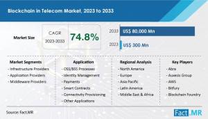 ROCKVILLE, MARYLAND, UNITED STATES, October 18, 2023 /EINPresswire.com/ -- The North American Blockchain in Telecom Market is anticipated to witness a robust growth rate, with a projected compound annual growth rate (CAGR) of 46% throughout the forecast period. Blockchain technology is playing a pivotal role in expediting transaction processing and enabling decentralized operations, addressing numerous challenges faced by telecom operators in North America.On a global scale, the blockchain in telecom market share is poised for remarkable expansion, projected to experience an extraordinary CAGR of 74.8%. By the year 2033, it is expected to reach a substantial market valuation of US$ 80 billion, a significant leap from its 2023 valuation of US$ 300 million. Often referred to as the technology that instills trust in contexts where it is lacking, blockchain has, in recent years, gained momentum within the telecom industry, although it has already established its presence in various other sectors.