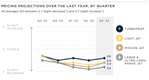 Overall, business aircraft valuations remain relatively stable with newer models and higher pedigree aircraft coming off of their peak prices by 5 to 10 percent. Older models have dropped in value by 15-20 percent for less preferred aircraft sold over the past couple years. Aircraft utilization has remained solid, within a few percent of the third quarter of 2022 and well ahead of 2019 levels.