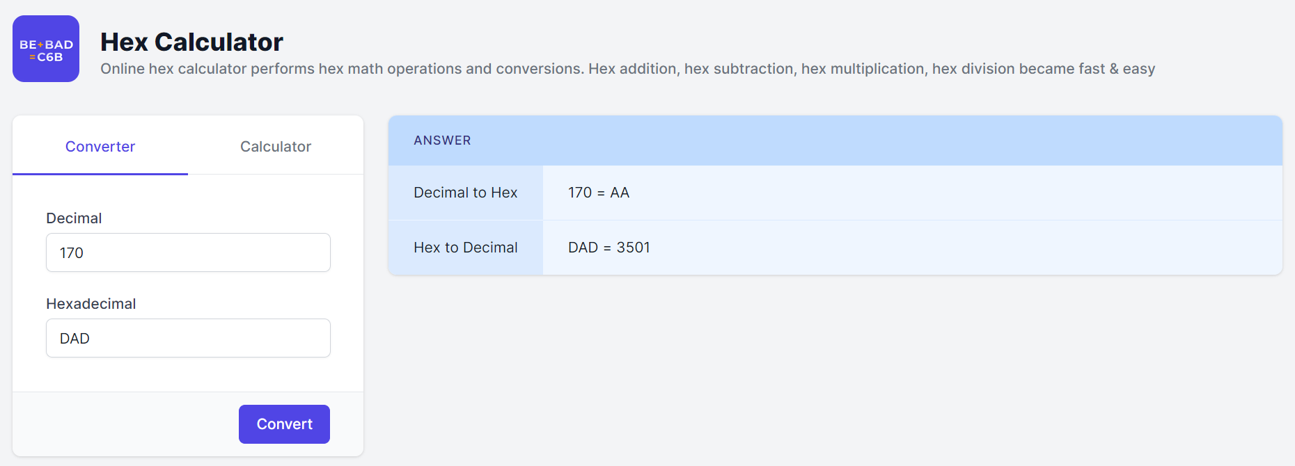LAS VEGAS, NEVADA, USA, October 28, 2023 /EINPresswire.com/ -- In an era where digital computation forms the backbone of various sectors, understanding and interpreting hexadecimal numbers have become a significant necessity. Catering to this need, Calculator.io has introduced its intuitive Hex Calculator, designed to simplify hexadecimal calculations, crucial in computing, digital electronics, and more.The Hex Calculator is an efficient online tool that performs arithmetic operations with hexadecimal numbers. It is designed to add, subtract, multiply, or divide hexadecimal values, a common numeral system for computer science applications. This function is particularly essential for programmers, developers, and students who frequently engage with low-level software running closer to machine language, where hexadecimal codes are prevalent.