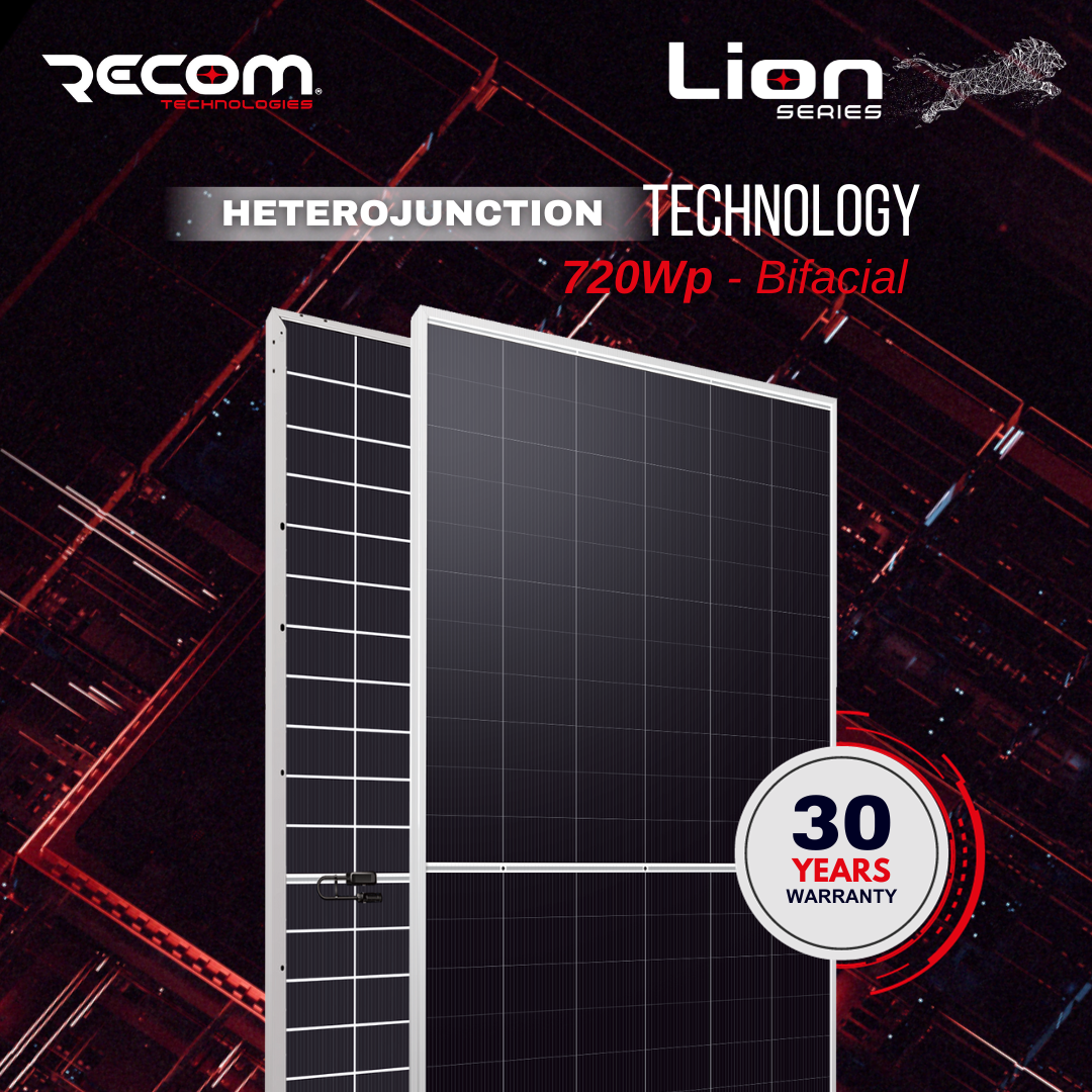LANNION, FRANCE, October 23, 2023 /EINPresswire.com/ -- RECOM Technologies, α leading renewable energy company and the only European Bloomberg Tier 1 PV module manufacturer, expands the the LION Heterojunction series and introduces the Lion 720Wp Bifacial HJT Mono Crystalline Double Glass Module, setting a new standard in the solar industry. With leading power output 720Wp and exceptional 23.2% module efficiency, this innovative module is a game-changer for clean energy adopters.Boasting the industry's highest output, the Lion 720Wp module ensures unparalleled energy consistency and longevity ensuring a lasting return on solar investments. Due to its enhanced bifaciality, this module maximizes energy harvesting even during low-light conditions and cloudy days.