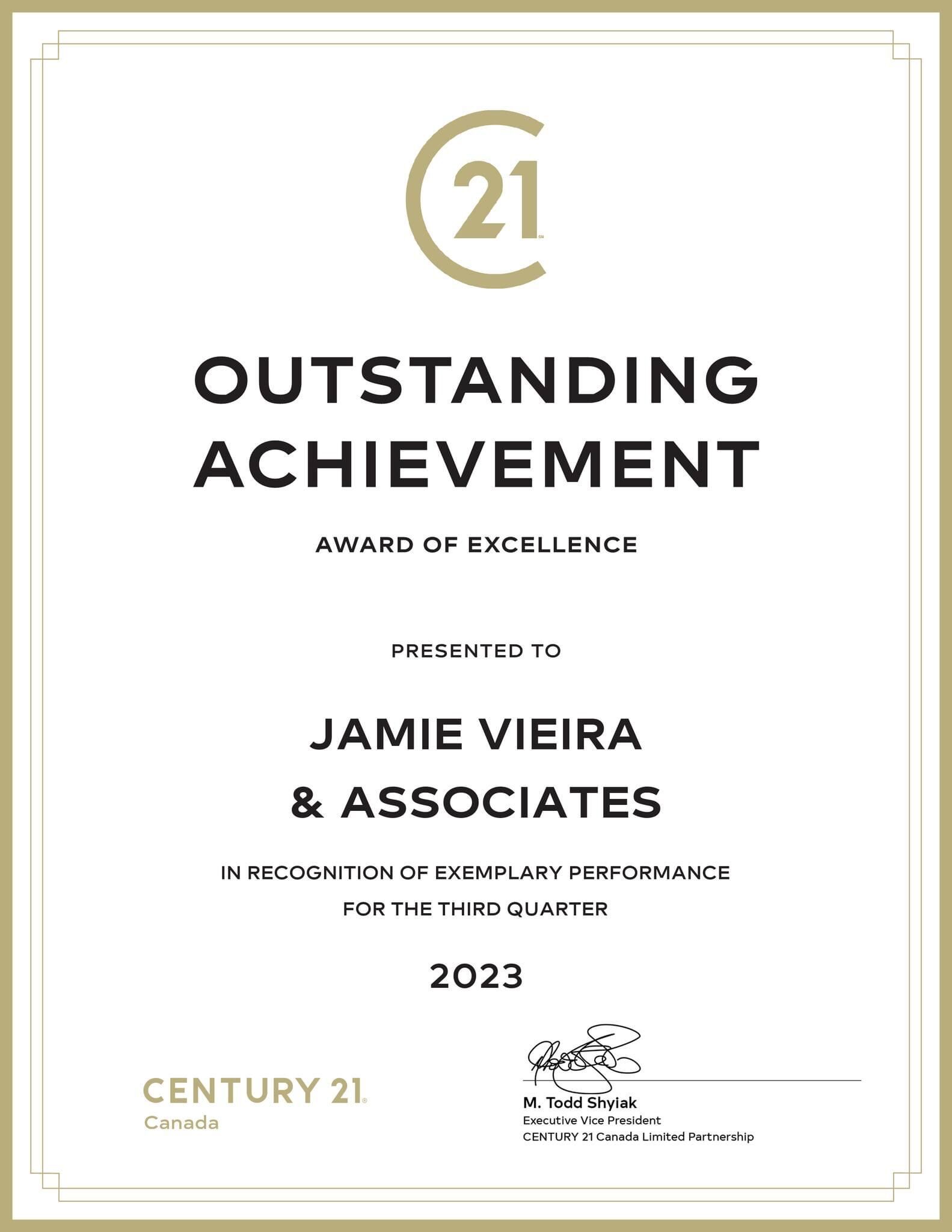 Jamie Vieira & Associates receives the Q3 2023 Outstanding Achievement Award by Century 21 Canada, underscoring a commitment to exceptional real estate service.