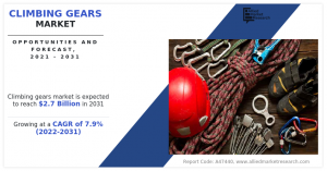 PORTLAND, 5933 NE WIN SIVERS DRIVE, UNITED STATES, October 27, 2023 /EINPresswire.com/ -- According to a new report published by Allied Market Research, titled, “Climbing gears Market," The climbing gears market size was valued at $1.3 billion in 2021, and is estimated to reach $2.7 billion by 2031, growing at a CAGR of 7.9% from 2022 to 2031.