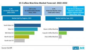 ROCKVILLE, MD, UNITED STATES, November 1, 2023 /EINPresswire.com/ -- The coffee machine market in the South-Western United States holds a commanding 27.8% market share, and it is anticipated to experience a 5.9% compound annual growth rate (CAGR) over the next decade. Following closely behind is the coffee machine market in the Western United States, with a 24.5% market share and an expected 5.5% CAGR increase.The U.S. coffee machine market size presently holds a market worth $5.5 billion and is expected to experience a compound annual growth rate (CAGR) of 5.2%. This growth is anticipated to lead to a market value of $9.1 billion by the conclusion of 2032, resulting in a substantial dollar opportunity of $3.7 billion throughout the forecast period from 2022 to 2032.