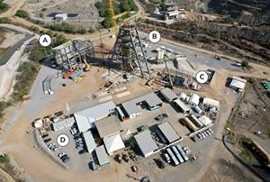 October 2023 aerial view of the Caraíba Operations shaft project, including (A) the permanent rock and personnel winders, (B) the completed shaft headframe, (C) the stage winder foundation, and (D) engineering and administrative buildings.