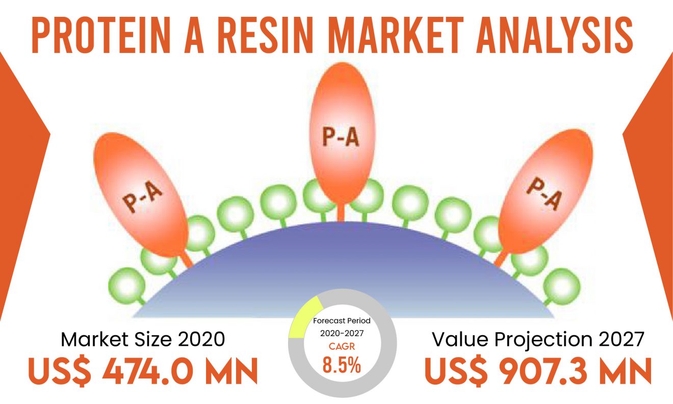 The global protein A resin market is estimated to account for US$ 511.7 Mn in terms of value in 2020 and is expected to reach US$ 907.3 Mn by the end of 2027.