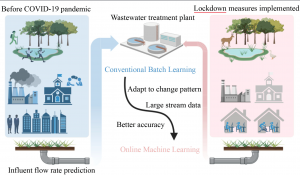 The online learning models developed by the team are called Adaptive Random Forest, Adaptive K-Nearest Neighbors, and Adaptive Multi-Layer Perception. They are based on the conventional batch learning models known as Random Forest, K-Nearest Neighbors, and Multi-Layer Perception. The team used their newly developed online models to predict the changing influent flow rate that resulted because of COVID-19. The pandemic had a profound impact on people’s daily lives. The lockdowns that closed schools, non-essential services, and recreational facilities changed the behaviors and movements of billions of people. These changes impacted wastewater treatment plants.